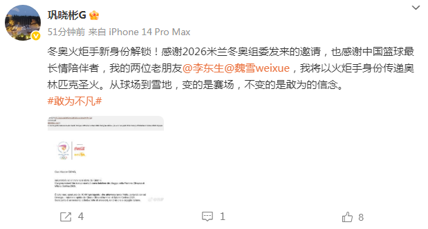 巩晓彬通过社媒晒出自己获得2026年米兰冬奥组委发来的火炬手邀请信,并且配文写道:“冬奥火炬手新身份解锁!感谢2026米兰冬奥组委发来的邀请,也感谢中国篮球最长情陪伴者,我的两位老朋友李东生和魏雪。我将以火炬手身份传递奥林匹克圣火。从球场到雪地,变的是赛场,不变的是敢为的信念。”